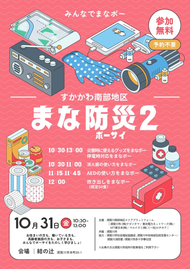 そこで、須賀川南部地区エリアプラットフォームでは、昨年に引き続き、住民/企業/福祉施設/行政などが合同で行う地域一体型の防災イベント「まな防災2」を開催いたします!